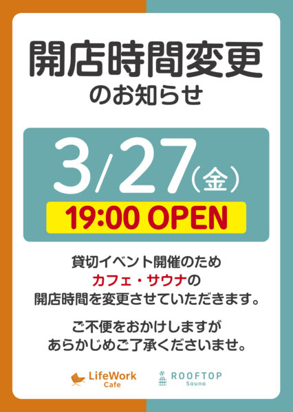 3/27(金)貸切イベント開催のため 3Fカフェ・4Fサウナの開店時間を変更させていただきます。 ご不便をおかけしますが あらかじめご了承くださいませ。