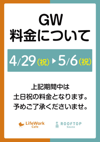 4/29(水祝)〜5/6(水祝)の期間は、土日祝日ご料金でのご案内となります。